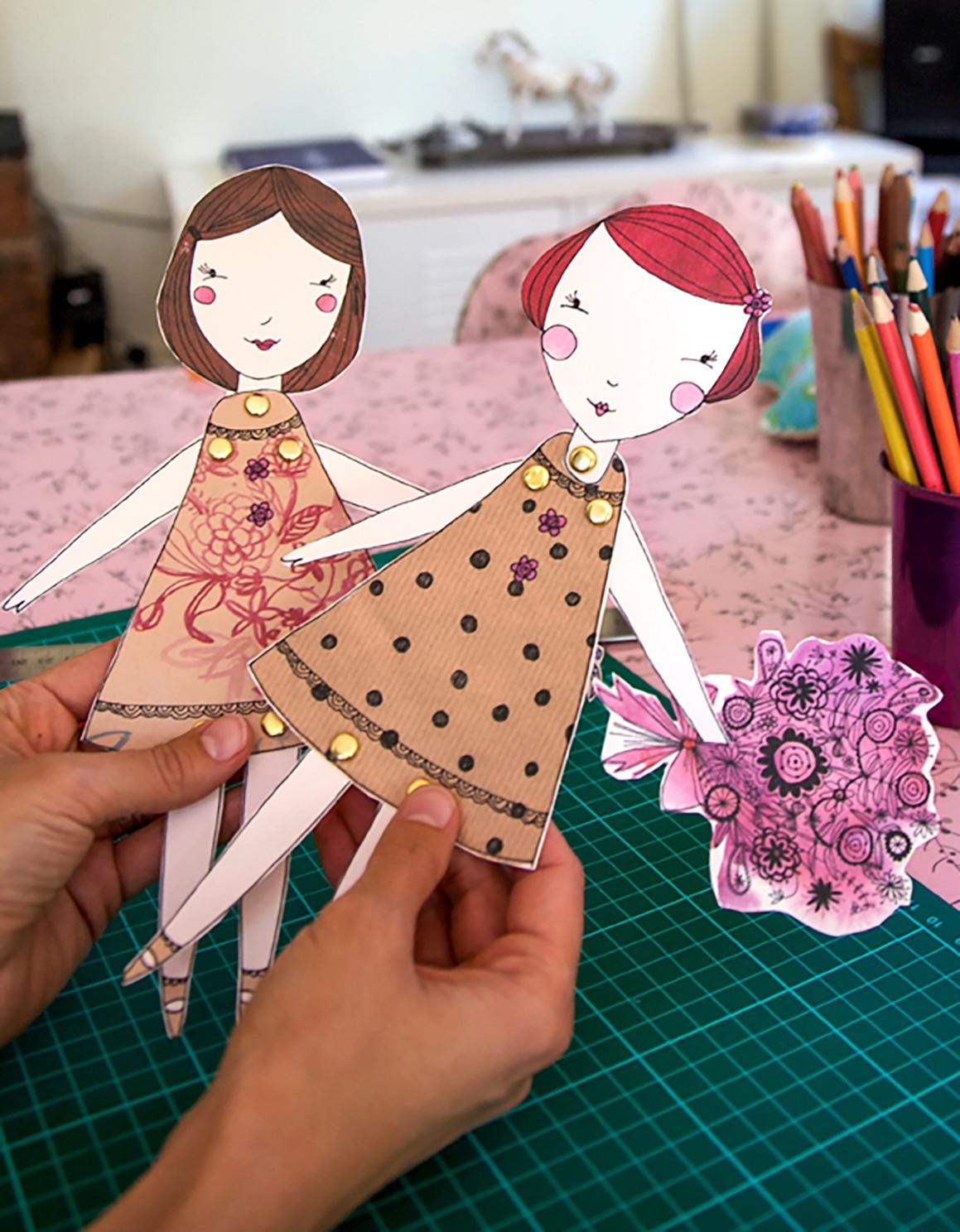 Perfect for busy parents, teachers, or anyone who loves a creative project, these two charming dolls come with illustrated accessories, including a handbag and flowers —ready to print, cut, and bring to life.